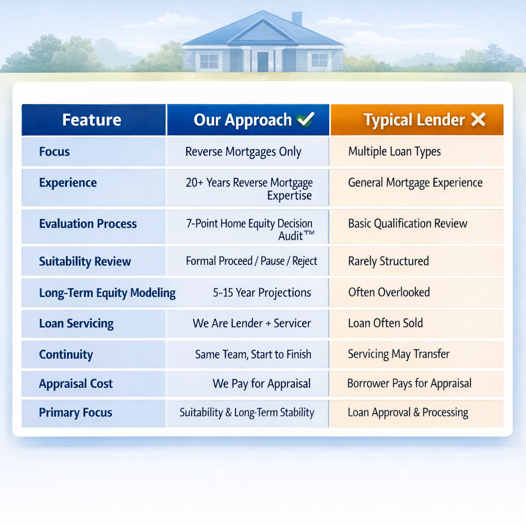 Reverse mortgage programs are federally regulated. Rates and structures are largely standardized. The real difference is experience, evaluation, and long-term servicing continuity.
